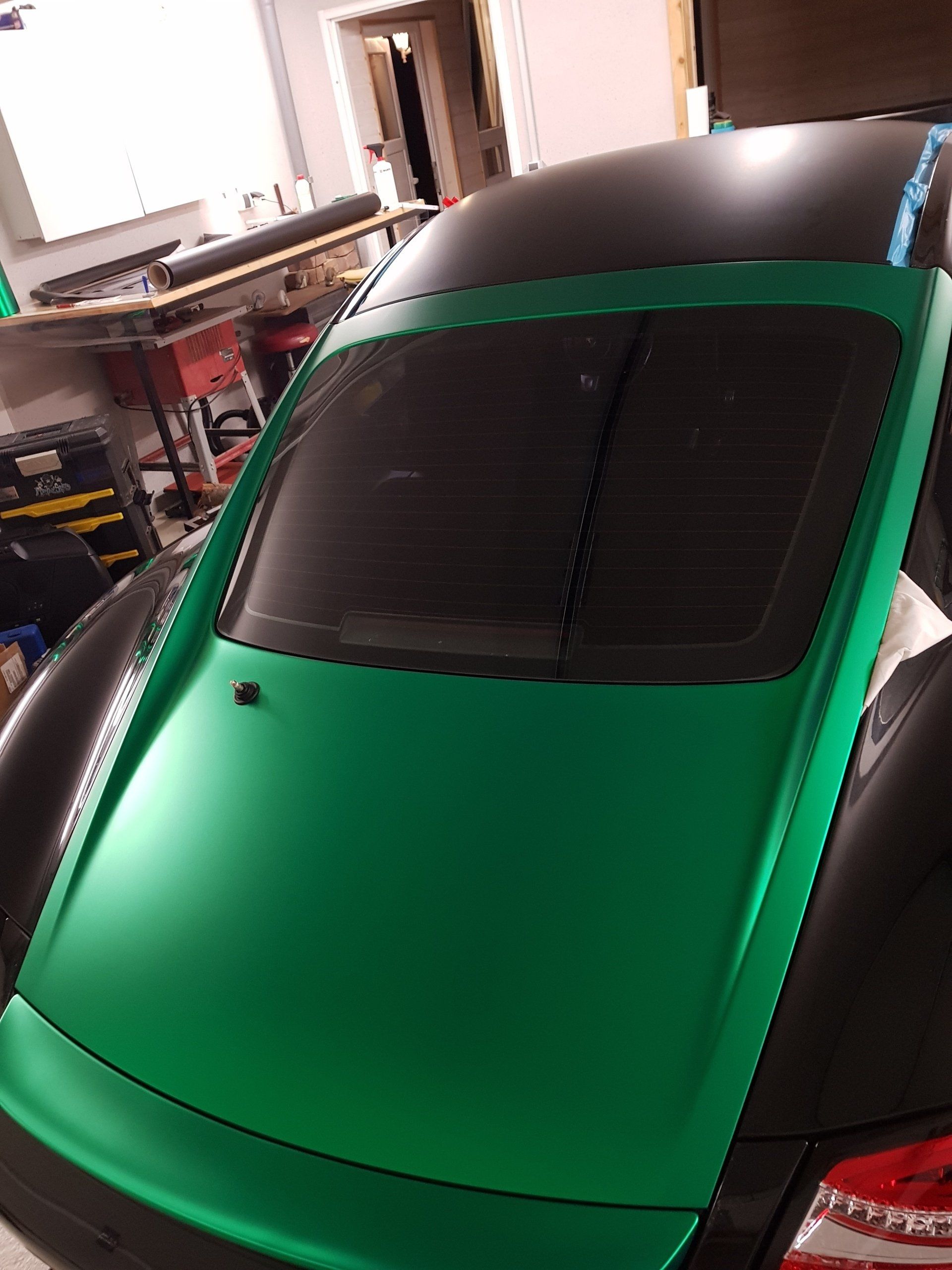 Vollfolierung in hunter green von Teckwrap. Eine hochglänzende Folie mit einem flipflop-artigen Effekt. Je nach Blickwinkel wirkt der Wagen dunkel grün oder fast schon schwarz.