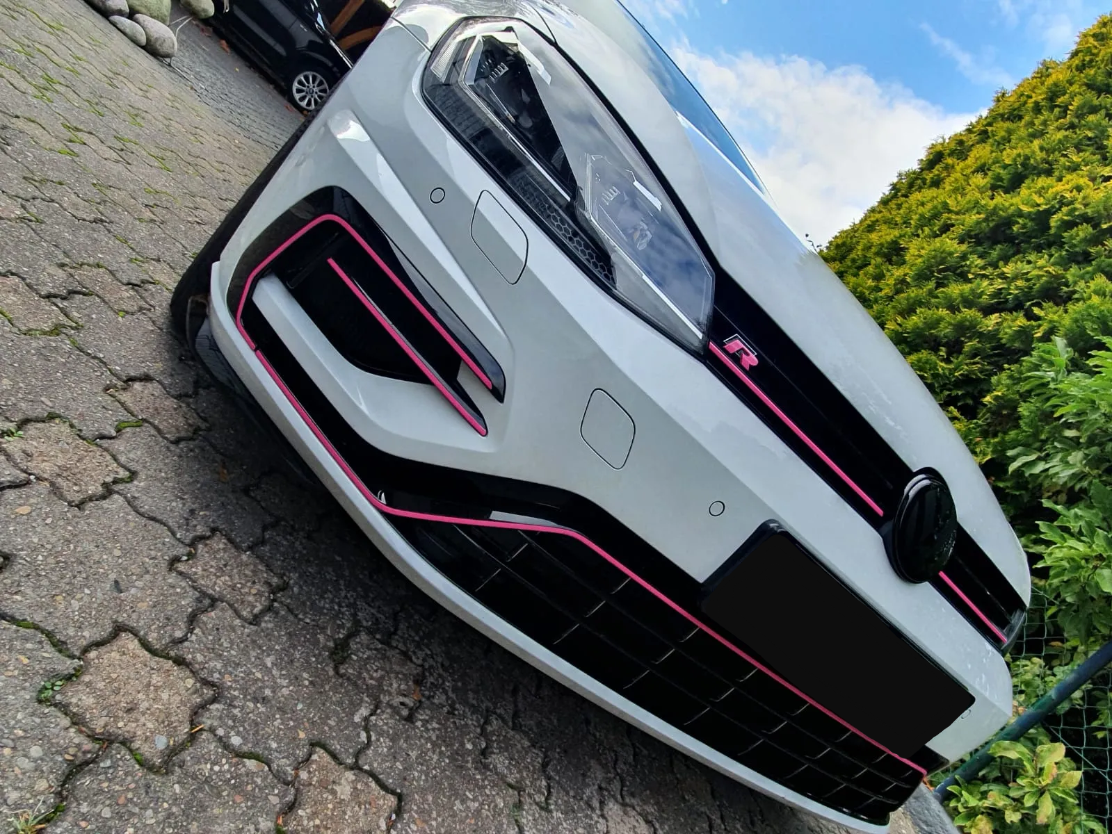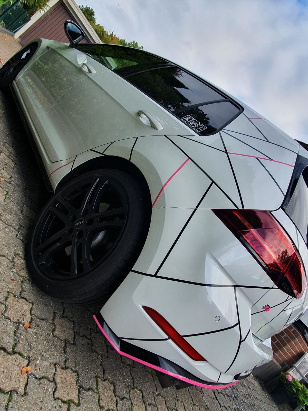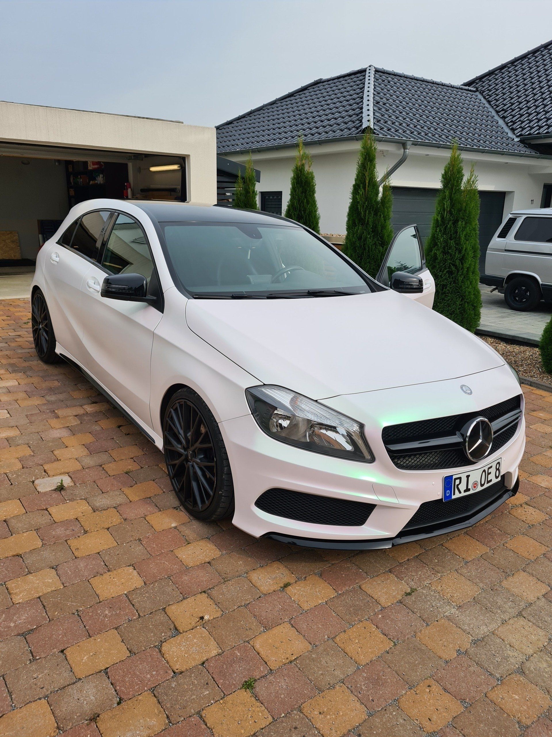 Fullwrap in aurora white von Teckwrap. Sehr geiler rosè Schimmer in der Folie! Auf besonderen Wunsch der Kundin haben wir ein paar böse Highlights gesetzt!. Dach, Spiegel, Frontlippe, Chromleisten, Zierleisten und MB Stern auf der Heckklappe bekamen eine schwarz glänzende Folie von OraCal. Scheibentönung inklusive!